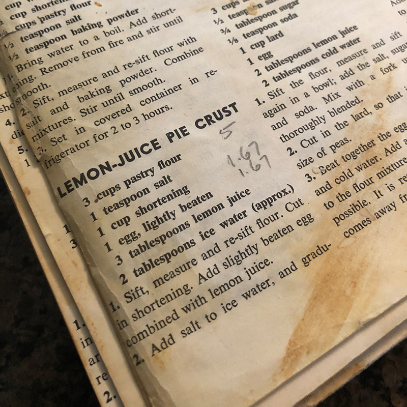 She has this ancient cookbook with the lemon juice pastry recipe (right next to the Lard Pastry recipe). She pulls an old ice cream bucket of huckleberries out of the freezer… Throws in a bit of this and a bit of that, some sugar, lemon, eye of newt…